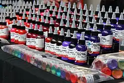 Tattoo inks are pigments, i.e. very fine powdered colorants. These materials are a water-based liquid. Many of these pigments are also used as artist paints, textiles,[3] automotive paint,[5] or for printer's ink.[6] Most inks are organic compounds,[7] such as azo dyes and pigments.[3] Some inks also often contain heavy metals.[7] Pigments can be small bits of solids or discrete molecules, such as titanium dioxide or iron oxide.[2]