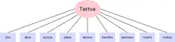Jain philosophy explains that nine (Śvetāmbara tradition) or seven (Digambara tradition) tattva (truths or fundamental principles) constitute reality.[1] These are:[2]