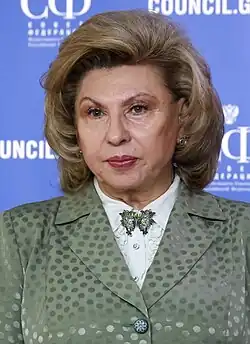 Tatyana Nikolayevna Moskalkova (Russian: Татья́на Никола́евна Москалькóва; born May 30, 1955, Vitebsk, Byelorussian SSR, USSR[1]) is a Russian lawyer, teacher, and politician. She has been Russia's Commissioner for Human Rights since 22 April 2016,[2] succeeding Ella Pamfilova,[3] and is the Deputy of the State Duma of the Federal Assembly of the Russian Federation V and VI convocations.[2]