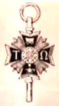 The fraternity's insignia was a key shaped like a Maltese cross, with a superimposed airplane engine and propeller.[1] On the horizontal arms of the cross were the Greek letters Τ and Ω. One the vertical arms of the cross were a covered wagon and lamp of learning on the cross, symbolizing the pioneering spirit and knowledge required for the field of aeronautics.[1]