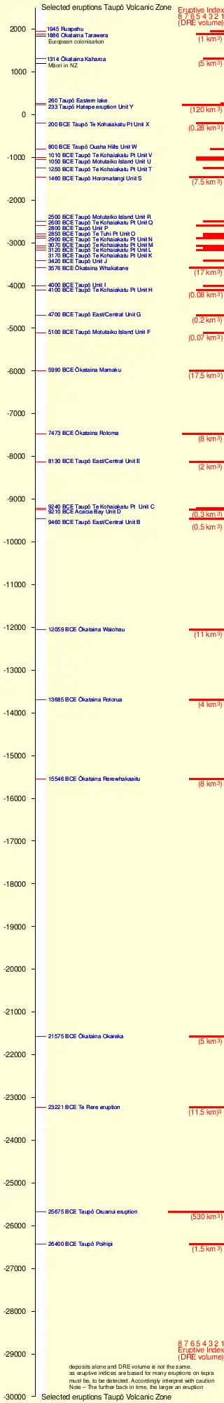 Taupō erupted an estimated 1,170 km3 (280 cu mi) of DRE material in its Oruanui eruption 25,580 years ago.[8] This was Earth's most recent eruption reaching VEI-8, the highest level on the Volcanic Explosivity Index.