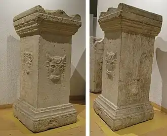 The Taurobolic Altar (French: Autel taurobolique) is an inscribed ancient Roman altar found in 1704 in a vineyard belonging to a certain Bourgeat on the Fourvière hill in Lyon, France. It dates to the year AD 160 and refers to a taurobolium carried out in Lugdunum to Cybele for the restoration of the emperor Antoninus Pius's health. It is now held at the Gallo-Roman Museum of Lyon.