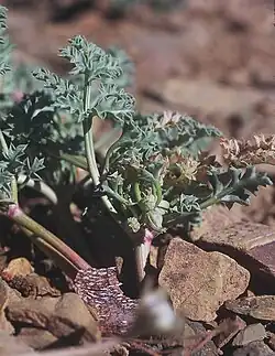 Tauschia howellii is a rare species of flowering plant in the carrot family known by the common names Howell's umbrellawort[2] and Howell's tauschia. It is endemic to the Klamath Mountains of far southern Oregon and far northern California, where it is limited to nine occurrences in the Siskiyou Mountains.[3] It grows in mountain forests on gravelly granite soils, often among stands of Shasta red fir (Abies magnifica var. shastensis). Despite its rarity it is stable and not considered very endangered.[3] It is a perennial herb growing 30 to 80 centimeters tall. It is hairless in texture. The thick leaves have blades which are divided into leaflets large, sharp teeth and edges curved up, and borne on long petioles. The short inflorescence is a compound umbel of yellow flowers on a few short rays. The fruit is oblong, ribbed, and just a few millimeters long.