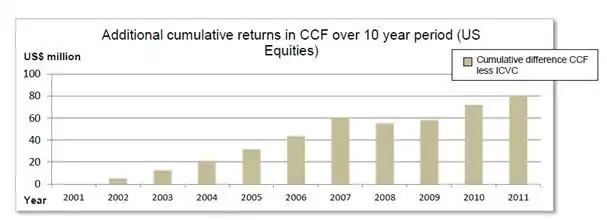 - Research conducted by Northern Trust[9] has illustrated the potential savings obtained by avoiding the drag on WHT, comparing a traditional Collective Investment Vehicle such as an Irish Investment Company with Variable Capital (ICVC) vs a CCF. Investors, who are in a traditional Irish ICVC and invest in the US equity markets that should be exempt from paying tax, suffer a 30% WHT on U.S. dividend income. The following graph illustrates the cumulative difference of a CCF less an ICVC, thus highlighting the positive impact a TTF would bring to the UK verses opaque fund structures.