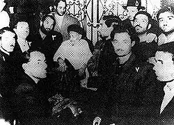 1. Hossein Alam 2. Tahir Hajrezaei 3. Shaban Jafari 4. Hossein Mehdi Kasab 5. Tayeb Hajrezaei 6. Akbar Hajrezaei 7. Seyyed Akbar Kharat next to Abol-Ghasem Kashani.