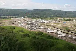 Following the construction of a natural gas processing plant by Westcoast Energy in 1985, Fibreco Pulp opened its sawmill in 1988, and the Village was re-incorporated into the District of Taylor in 1989. Despite the closure of the Petro-Canada refinery in 1991, economic growth continued throughout the decade as Westcoast Energy's McMahon Gas Plant expanded in 1991 and added a cogeneration plant in 1993. Fibreco Pulp doubled its capacity in 1996, the Younger Natural Gas Liquids Extraction Plant (to extract water and sulphur from natural gas) was expanded in 1996, and the Taylor Straddle plant (to extract ethane from natural gas) was built in 1997. Since 1993, the town of 1,373 residents have built a new hockey arena, leisure skating arena, curling rink, and an 18-hole golf course. Strong community pride also developed as demonstrated by the town placing first at the provincial level, in its small category, in the parks and gardens-oriented Communities in Bloom Competition in 1997 and second in the national competition in 1998.[4][7] Other local projects have included building a memorial garden and cenotaph in 2000 dedicated to the 341st Engineers of the U.S. Army corps of Engineers who were stationed on the Taylor Flats in 1942 during the construction of the Alaska Highway and the Peace River Suspension Bridge.