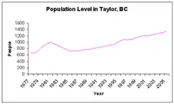 Major industrial development began in 1957, when Westcoast Energy (later Duke Energy) built the province's first gas processing plant, as well as a refinery and pipeline to Kamloops.[5] The community that formed around this industrial development was incorporated as a village on August 23, 1958, and soon after Canfor opened a planer mill. Meanwhile, 120 km (75 mi) upstream, the W.A.C. Bennett Dam was completed in 1966 and the Peace Canyon Dam in 1980, which controlled the level and flow of the Peace River, making navigation and flood control much easier. The 1961 Canadian census, the first to recognize Taylor as a census subdivision, counted 438 people.[6] During the subsequent five years the population rose 36% to 595 people but rose only a further 2% to 605 people by 1971.[6]