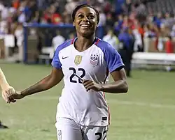 In January 2017, Smith was called into training camp for the United States women's national soccer team for the first time by head coach Jill Ellis.[24] She earned her first cap for the team on July 27 when she started in the right back defender position during a match in Seattle against Australia at the 2017 Tournament of Nations.[25][26]