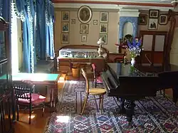 The reception room and study on the second floor, where his piano is located, is the largest room of the house. The piano is a Becker, which was given him by the St. Petersburg firm in 1885, when he first arrived in Maidanovo. Tchaikovsky never played the piano in a concert hall for an audience, but he did play at home for his guests, and enjoyed playing duets on the piano with visiting musicians. His evening entertainments also usually included oral readings of literature.[2]