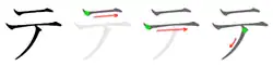 て, in hiragana, or テ in katakana, is one of the Japanese kana, each of which represents one mora. Both represent [te].[1]