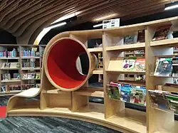 A distinctive feature and anchoring piece of interior architectural work is in the children's area on Level 1 named 'Te Whare Tapere' (meaning a place of entertainment, story-telling, dance, games, music and other entertainment[9]). The space was designed by multidisciplinary award-winning artist Robin Rawstorne[1] and was inspired by the concept of a pool in the middle of a forest glade with ripples radiating outwards. The ripples reflect the growing levels of a young readers development. The space was designed to encourage play, ownership and investigation and includes a stage for story-telling and performances, nooks to curl up in and moveable book bins to change the area's shape and size.[10]