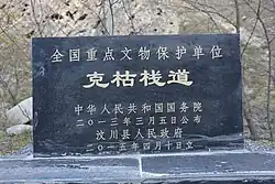 | Kegu Plank Road | Kegu Township, Wenchuan County | 31°30′9.1″N 103°34′17.1″E / 31.502528°N 103.571417°E | Located on the north bank of the Miscellaneous Valley Brain River in Keku Township, Wenchuan County, the surviving site is 158 metres long and 0.4–2 metres wide, including two Qing dynasty inscriptions. | ||
