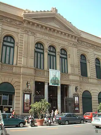 The Biondo Theatre (Italian: Teatro Biondo, complete name Teatro Biondo Stabile) is a neoclassical and Art Nouveau-style theater building located on Via Roma #258, corner with Via Venezia, in the ancient quarter of Castellamare of central Palermo, region of Sicily, Italy. Diagonally across Via Roma is the ancient church of Sant'Antonio Abate and a stairwell descending into the warrens of the Vucciria Market.