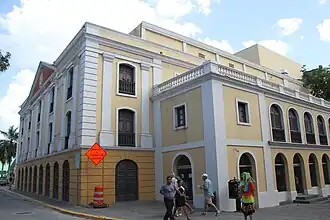 The theater faces east, across from Plaza de Colón, on Fortaleza Street, and was constructed in 1824. It was designed in the Italian style as a horseshoe shaped opera house with three tiers of boxes. A block south lies a brick-shaped former Casa de camineros, house of road-maintainers. To the north-east lies a string of cultural institutions: the restored Casino de Puerto Rico, the YMCA, the Carnegie library, the Ateneo Puertorriqueño, and Moorish-inspired Casa de España. In the northern seaward cliff sprawls the historic and labyrinthine fort of San Cristóbal. The original landward gate of old San Juan lays just east of this site on Calle Fortaleza.