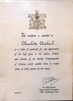 During the First World War the British Armed Forces awarded the Allied Subjects' Medal to Allied or neutral citizens who had rendered assistance to British personnel – often those who had escaped from behind enemy lines. During the Second World War the King's Medal for Courage in the Cause of Freedom and the King's Medal for Service in the Cause of Freedom were awarded for similar actions, including to many who had provided aid to British personnel evading Axis forces or escaping from captivity. The Tedder certificate was instituted as a lower level award for those who did not qualify for the medals.[1]