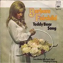 "Teddy Bear Song" is a 1973 single written by Don Earl and Nick Nixon, and made famous by country music vocalist Barbara Fairchild. Released in December 1972, the song was Fairchild's only No. 1 song on the Billboard magazine Hot Country Singles chart in March 1973.[1] The song also became a modest pop hit, peaking at No. 32 on the Billboard Hot 100 in June 1973.[2]