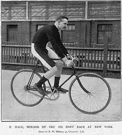 In 1896 Hale participates in the individual Six Days race in New York City's Madison Square Garden and wins with 1910 miles and 8 laps in a field of 30 riders, breaking the existing record by 300 miles.[5][6] With this victory in front of 12,000 spectators he earned US$5,000. After the end of the race, when he allegedly continued disoriented for another ten laps, it was said:[7] "He looked like a ghost. His face was like the white face of a corpse and he stared in front of himself, his eyes terribly fixed [...] His mind was no longer there on the track, he had lost all signs of life and self possession."[8] He himself added: „I won, but I have given 10 years of my life away for a few thousand dollars.“[9] The next year, though, he participated again and obtained the third place.[5]