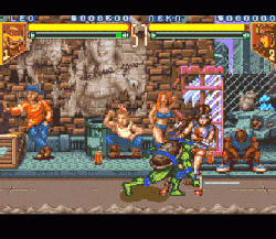 The Genesis version uses the standard three-button controller, with only two buttons for attacking (punch and kick). To perform stronger punches or kicks, the player must hold the directional pad towards the opponent while pressing either attack buttons. The third button is used for taunting. Some of the stages in the game feature destroyable scenery that gives the player and their opponent access to new areas in the stage. As well as their special moves, each character has a 'killer' attack which is only accessible when they are close to death and the red part of the characters' life gauge at the top starts flashing. This is done by pressing the Taunt button in conjunction with a specific D-Pad motion. These moves nearly take out the other character's life gauge completely.