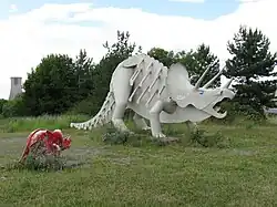 The park was started as a result of entering an Art to Landscape competition organised by The Sunday Times and the Arts Council.[1] Middlesbrough Council had commissioned a life size painted steel sculpture of a triceratops called Teessaurus from Genevieve Glatt[1] that was fabricated by Harts of Stockton at a total cost of £16,000[1] and installed on a mound at the northern end of the park. The park was opened with this sculpture in 1979[2][3][4][6] and two infant triceratops were added later.[1] From 1987 onwards, a life-size brachiosaurus, brontosaurus, mammoth, stegosaurus and tyrannosaurus sculptures were added at the sides of the park.[2][3][4][6] These sculptures were built by workers on the government Youth and Employment Training Scheme at Amarc Training and Safety.[3][6][8]