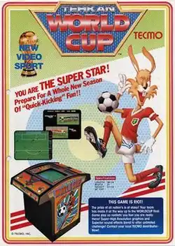 Tehkan World Cup,[c] originally released as World Cup[d] in Japan,[3] is an association football video game released to arcades in 1985 by Tehkan, the former name of Tecmo. It features multiplayer gameplay and trackball controllers.[4] It was released in both upright and table arcade cabinets,[1] but was most commonly released in a cocktail cabinet form factor.[4] Its arrival coincided with the buildup to the 1986 FIFA World Cup. It featured the then colors of several of the world's top teams such as West Germany, Argentina and Brazil, although it did not mention any team by name.[4]