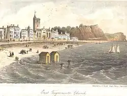 There were originally two villages, East and West Teignmouth, separated by a stream called the Tame, which emptied into the Teign through marshland by the current fish quay.[4] Neither village is mentioned in the Domesday Book but East Teignmouth was granted a market by charter in 1253 and one for West Teignmouth followed a few years later.[5] The Tame now runs under the town in culverts and is visible only higher up the town as Brimley Brook, joined by smaller streams such as the Winterbourne (an intermittent stream, which flows only in winter or after heavy rain).