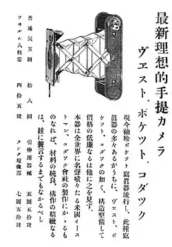 ^Vesutan no tsukaikata (ヴェス単の使ひ方; How to use the Vest Pocket Kodak; OCLC673309139); five years later, Vesutan Pāretto no tsukaikata (ヴェス単パーレットの使ひ方; How to use the vest-pocket Pearlette; OCLC672633250). (The Pearlette was a near-copy by Konishiroku of Contessa-Nettel's Piccolette, itself derived from the Vest Pocket Kodak.)