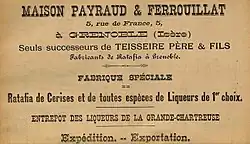 The Teisseire business, which was located at Place Grenette in Grenoble, then passed to Mathieu's son, Mathieu II. With the death of Mathieu II in 1781, it was run by his widow and younger son Camille Teisseire whom he had named as his principal heir. For some time after Mathieu II's death, the company was known as Veuve Teisseire & Fils (The Widow Teisseire and Son).[4] In addition to running the family business, Camille Teisseire was an active politician, serving on the Grenoble city council during the French Revolution and later as the Deputy for Isère in the French Parliament. The family further increased its wealth and diversified its holdings when it formed an alliance with the Perier family through Camille's marriage to the daughter of Claude Perier. When Camille Teisseire took up his seat in the French Chamber of Deputies in 1820, he turned the management of the distilling business over to his eldest son Charles, and the company became known as Teisseire, Père & Fils (Teisseire, Father & Son). At that time in addition to their Ratafia de Teisseire, the firm was producing 5 other liqueurs, 19 varieties of eau-de-vie, 8 varieties of wine and spirits, and 24 varieties of crème alcoolisée (a type of liqueur with an elevated sugar content).[5]