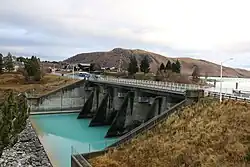 Lake Tekapo township started to grow after the construction of hydropower stations in the 1940s. Prior to this, the town consisted of "two station homesteads, a private hotel, and several holiday cottages".[6] The project was delayed due to World War II, but it was eventually completed and commissioned in 1951.[5] The control gates built across the outlet of Lake Tekapo regulate the amount of water entering the Tekapo River. These were completed in 1940. State Highway 8 runs across the top of them.[7]