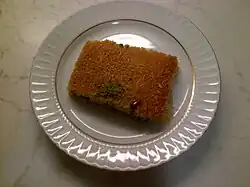 Tel kadayıf (Turkish: Tel kadayıf) is a Turkish dessert commonly served during the month of Ramadan. Kadayif noodles are used in making tel kadayıf. It is baked in the oven after nuts such as peanuts or walnuts are placed between the layers of kadayıf noodles. It is served by pouring a sugary syrup on it.