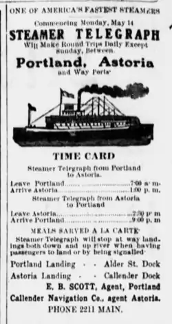 In May 1906, Telegraph was advertised as making a daily run from Portland to Astoria, Oregon, at way landings up and down river if there were passengers to land, or if signaled.[15] Telegraph was to depart from Portland at 7:00 a.m. and arriving at Astoria at 1:00 p.m.[15] Returning, Telegraph was to depart Astoria at 2:30 p.m. and arriving at Portland at 9:00 p.m.[15] The Portland landing was the Alder Street Dock, and the Astoria Landing was the Callendar dock.[15] Meals were advertised to be "sarved [sic] a la carte."[15] E.B. Scott was the Portland agent, and Callendar Navigation Co. was the Astoria agent.[15]