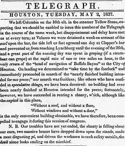 Although Burnet had expected the 1st Congress to name Columbia the capital, they instead chose a brand-new city, Houston.[27] The new capital had only been founded on August 30, 1836 and the land was still being surveyed at the time of its elevation to capital.[31] Houston and Columbia were separated by 50 miles (80 km) of boggy river bottoms. It was very difficult to transport large loads overland, so publishers made arrangements to ship the printing press via boat.[32] On April 16, 1837, the press arrived in Houston, on the same boat as the executive departments of the Republic of Texas.[33] The first issue to be printed in Houston appeared on May 2, 1837.[28]
