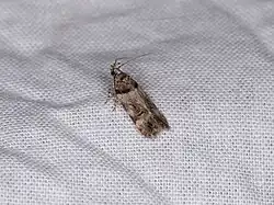 The wingspan is 19–21 mm. The forewings are bluish white, overlaid with fuscous, black and brown scales and with a rather well defined outwardly oblique fasciae of black raised scales from near the base of the costa to the basal fourth of the dorsum. There is an ill-defined light fuscous spot on the middle of costa, as well as an ill-defined transverse shade of fuscous over the end of the cell, edged exteriorly by a narrow nearly unmottled white fascia. There is also a short transverse streak of black-and-brown raised scales at the end of the cell and the tip of the wing is overlaid with fuscous.[3]