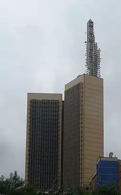 The Teleposta Towers is the eighth-tallest building in Nairobi, Kenya.[1] The building is located in central Nairobi along Kenyatta Avenue. It is 120 meters or 394 feet in height. The towers have 27 floors, and it houses Telkom Kenya,[2] Kenya's Ministry of Information and Communications, and Kenya's Ministry of Trade. Construction of the towers was started in 1996, and completed in 1999.[3] It was designed by Dr Paul Ndarua and constructed by Laxmanbhai Construction.[1]