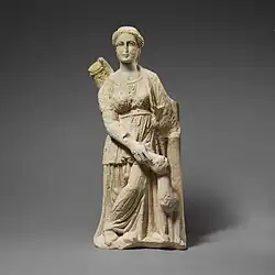 A glyconic meter, the Telesillan, was named for her.[17] The longest surviving fragment of Telesilla is two lines quoted by the grammarian Hephaestion to illustrate this meter, about the myth of Alpheus.[18] It is addressed to "maidens" (κοραι), and was possibly a choral poem written for performance at a local festivals,[14] used in the education of girls of noble families.[19]