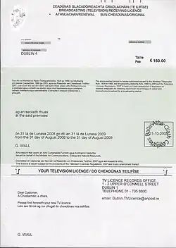 In Ireland, a television licence is required for any address at which there is a television set. Since 2016, the annual licence fee is €160.[1] Revenue is collected by An Post, the Irish postal service. The bulk of the fee is used to fund Raidió Teilifís Éireann (RTÉ), the state broadcaster. The licence must be paid for any premises that has any equipment that can potentially decode TV signals, even those that are not RTÉ's. The licence is free to anyone over the age of 70, some over 66, some Social Welfare recipients, and the blind. The fee for the licences of such beneficiaries is paid for by the state. The current governing legislation is the Broadcasting Act 2009, in particular Part 9 "Television Licence" and Chapter 5 "Allocation of Public Funding to RTÉ and TG4". Devices which stream television via internet do not need licences, nor do small portable devices such as mobile phones.[2]