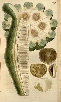 Telfairia pedata, commonly known as oysternut[4] (alternately spelled as 'oyster nut', etc.[5]), queen's nut,[4] Zanzibar oilvine[4] (alternately spelled as 'oil vine', etc.[5]), kweme or kulekula, is a dioecious African liana which can grow up to 30 metres long, having purple-pink fringed flowers, and very large (30–90 cm × 15–25 cm), many-seeded, drooping, ellipsoid berries which can weigh up to 15 kg[5] (though one old source from 1882 claimed up to 60 lbs).[6] It is valuable for having edible fruit, seeds and oil.[5]