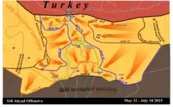 The Tell Abyad offensive or Martyr Rubar Qamışlo operation was a military operation that began in late May 2015 in the northern Raqqa Governorate, during the Syrian Civil War. It was conducted by the Kurdish-majority People's Protection Units (YPG) and the Free Syrian Army (FSA)[1] against the Islamic State of Iraq and the Levant. The offensive took place from the end of May until July 2015. The campaign was the second phase of the Kurdish Operation Commander Rûbar Qamishlo, which began with the Al-Hasakah offensive (May 2015), and involved the merger of the Kobanî offensive with the former. The focus of the campaign was to capture the key border town of Tell Abyad, and to link the Kobanî and Jazira Cantons in Northern Syria.