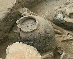 Numerous artefacts were recovered from the burnt buildings; they include pottery and stone vessels, figurines, and all sorts of tools. There were also many storehouses.[1]