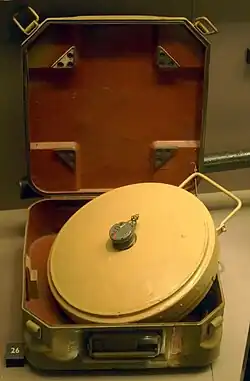 ![]() A pre-war Tellermine 35 in a carry case at the Imperial War Museum in London. The fuze is visible in the centre of the mine | |