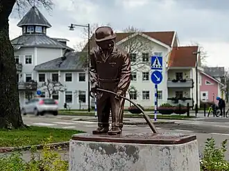Ernfrid is an industrial-historic gray iron statue made by Carl Meijer (1908-2004) that stands in the south-eastern corner along Kungsgatan and Rune B. Johanssons gata portraying a worker holding a handheld concrete vibrator.[11][12] It was cast January 13, 1970, together with three or four copies of the last melt from Vibro-Verket's foundry facility before it was put out of commission. The other copies were sent to the head office in Stockholm and the factories in Karlstad, Sweden and São Paulo, Brazil.[13] The prototype in bronze was given to Vibro-Verket's director Stig Giertz Hedström when he left.[13]
