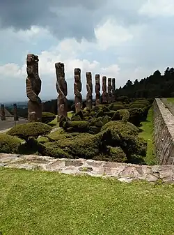At the most elevated spot are twelve silos or cones, each representing a generation of Otomis on which is a sculpture of Tata Jiade, the Sun.[10] While the construction is meant to reflect Otomi culture before the 9th century CE and Nahua influence, this latter influence is acknowledged by an image of Quetzalcoatl.[9]