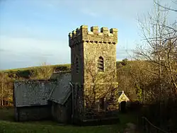 Temple Church is a Grade II* listed building built c.1120 on land owned by the Knights Templar. It became famous as a place where marriages could be performed without banns or licence (similar to Gretna Green until the early 20th century).[3] This came to an end in 1744 when the church first came under episcopal jurisdiction. By the mid-19th century, it had become a ruin and a final service was held on 29 January 1882, in front of a ″large congregation″ led by the Reverend J Brown.[5] It was rebuilt (by Silvanus Trevail) in the following year.[6] The church is dedicated to St Catherine.[7]