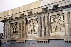 The ten metopai of the facade were sculpted in high relief and framed at the top and bottom by blank slabs which made the relief of the sculpture stand out. The metopes were separated by triglyphs which jut out a long way from the vertical plane of the metopes. Three metopes survive in full: a frontal view of a quadriga being driven vigorously by Helios, Perseus decapitating Medusa while Athena looks on, Heracles carrying the captured Cercopes on his shoulders. In the centre of the tympanum there was the mask of a Gorgon in terracotta.[8]