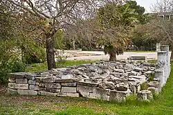 The temple is now located in the northern portion of the Agora, east of the Temple of Apollo Patroos and north of the Odeon of Agrippa, with which it is aligned.[15] An inscription from 99/100 AD mentions in passing that Titus Coponius Maximus was the priest of Ares Enyalius and Enyo (IG II2 1072), which is generally assumed to be the cult based in this temple.[26]