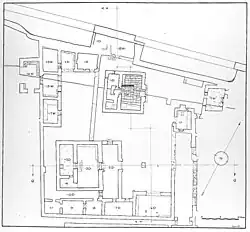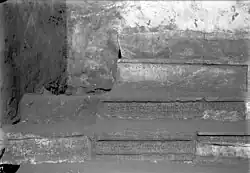 Archaeologist David Clark assigned a numbering system to the temple's 31 rooms, distinguished by the letter "W" for rooms along the wall line, and "D" for spaces in the interior of the block. This system likely emerged because Clark's team excavated both zones simultaneously before realizing they were the same entity.[3] The earliest inscription is dated to c. 12–13 CE and was discovered in Room W9, also known as the salle aux gradins or stepped room for its tiered interior structure.[4] The temple's rooms contain over 100 inscriptions in Greek and Latin, as well as a so-called "magic alphabet" in Room W14.[5] The majority of these inscriptions bear names of individuals. In the case of the inscriptions discovered in Room W9, enough genealogical information was available that archaeologist Susan M. Hopkins was able to construct family trees of the individuals attested in the inscriptions.[6]