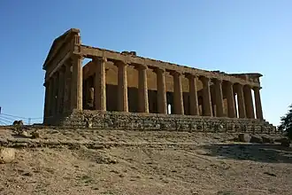 The Temple of Concordia (Italian: Tempio della Concordia, Greek: Ναός της Ομόνοιας) is an ancient Greek temple of Magna Graecia in the Valle dei Templi (Valley of the Temples) in Agrigento (Greek: Ακράγας, Akragas) on the south coast of Sicily, Italy. It is the largest and best-preserved Doric temple in Sicily[5] and one of the best-preserved Greek temples in general,[1] especially of the Doric order.[2][3] It is located a kilometer east to the Temple of Heracles.