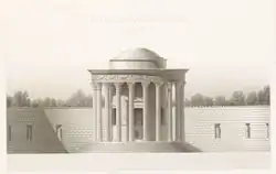 It is dated to the later 2nd century BC and was built either by L. Mummius Achaicus, conqueror of the Achaeans and destroyer of Corinth,[5] or by the trader Marcus Octavius Herrenus in gratitude for success in business.[6] The temple is 14.8 m in diameter and consists of a circular cella within a concentric ring of twenty Corinthian columns 10.66 m tall, resting on a tuff foundation. These elements supported an architrave and roof, which have disappeared.[7]