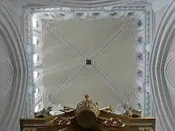 The exterior is grey/blue in colour, whereas inside, it is full of natural light and dazzling white. The interior is free of any excessive ornamentation and has no side altars. The focus of the building is to direct attention solely towards the main altar in the centre of the temple. A gilded baldaquin rests on top of four pillars. A papal tiara and the Keys of St. Peter are fixed to the baldaquin's front to symbolize that in the Mariavite Church, the highest authority is in Jesus, continuously present in the church signified by the fervent adoration of the Blessed Sacrament. On either side of the altar are Gothic stalls where Mariavite clergy sit during religious services. The doors, pews and floors of the Temple of Mercy and Charity are all carved in solid oak.