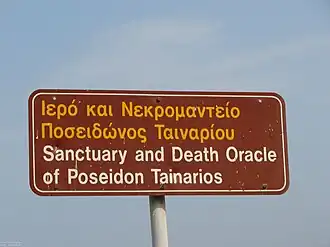 Strabo described the sanctuary as a sacred grove with a nearby cave. The geographer Pausanias wrote of a cave-like temple with a statue to Poseidon at its entrance. In antiquity, the cave was thought to be the entrance to Hades. When Sparta was devastated by an earthquake in 464 BC, it was said that the cause had been Poseidon's vengeance on the Spartan ephors after they had killed helots who had taken refuge at the sanctuary. It is thought that the sanctuary at Tainaron dates at least to a time when the helots were still independent, before they had been subjugated by the Spartans.[2][3]