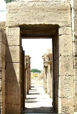 The second and fourth gateways contain cartouches in the name of Shabaka. The third gateway cartouche is in the name of Ptolemy XIII. The fifth gateway leading to the portico columns of Ptolemy III contains the title of Tuthmosis III and on the gate contains the name of Ptolemy III.